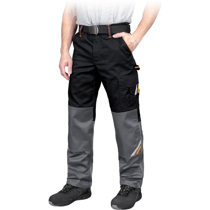 Spodnie ochronne do pasa PROX. - 65% poliester, 35% bawełna - gramatura 295-300 g/m2 - wstawki z żółtego i pomarańczowego materiału 80% poliester, 20% bawełna - zapinane na guzik i zamek błyskawiczny - dwie kieszenie z tyłu na rzepy oraz dwie boczne - jedna kieszeń na nogawce na rzepy na akcesoria oraz jedna boczna podłużna - gumka w pasie w tylnej partii zwiększa swobodę ruchów oraz umożliwia lepsze dopasowanie - na kolanach kieszenie na wkładki nakolannikowe - końcówka do przypięcia kluczy - wstawki z elemementów odblaskowych - sprawdzona jakość, udoskonalony design