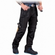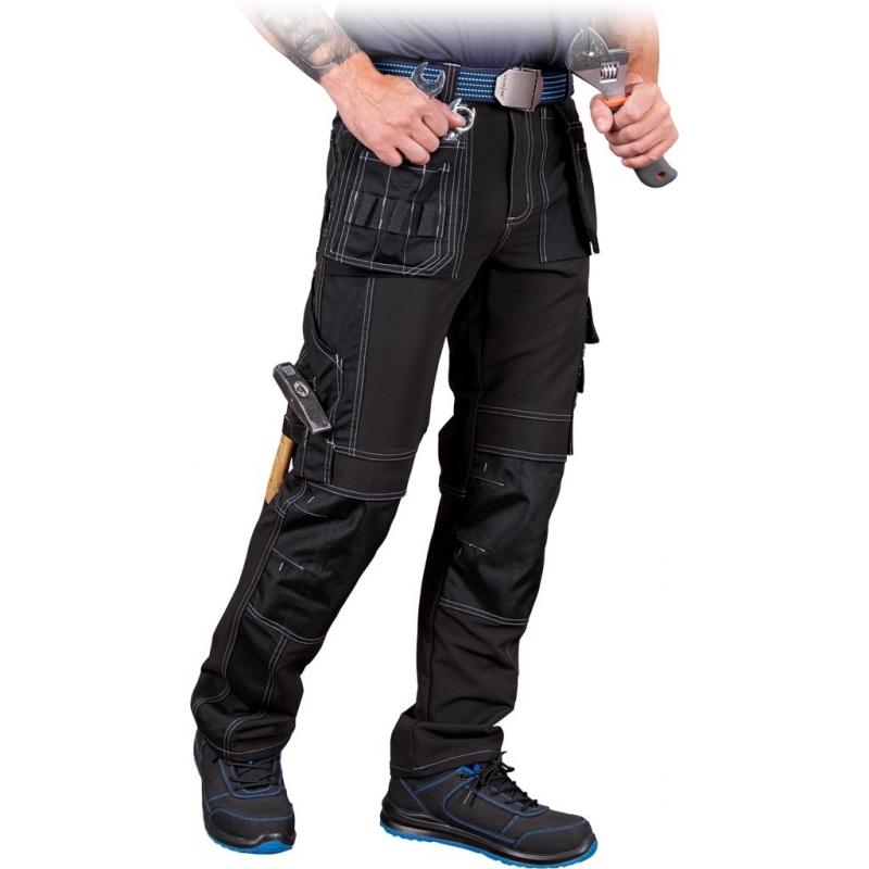 Spodnie ochronne do pasa EVERBLACK, męskie. - materiał główny: tkanina rip-stop stretch 92% poliester, 8% elastan o gramaturze 280 g/m2 - wstawki na kieszeniach oraz u dołu nogawek: tkanina 80% poliester, 20% bawełna o gramaturze 270 g/m2 - wzmocnienia na kolanach: tkanina Oxford 100% poliester o gramaturze 200 g/m2 - tkanina typu rip-stop - zabezpiecza przed rozdarciem w momencie zaczepienia o wystający przedmiot - zapinane na guzik oraz zamek błyskawiczny - dwie kieszenie boczne, dwie kieszenie montereskie z przegródkami oraz dwie tylne - kieszenie na nogawkach, w tym jedna potrójna zapinana na rzepy oraz jedna podłużna z przegródkami na akcesoria i uchwytem na młotek - kieszenie na wkładki nakolannikowe wkładane od góry z zapięciem na rzep - końcówka do przypięcia kluczy - odblaskowe elementy