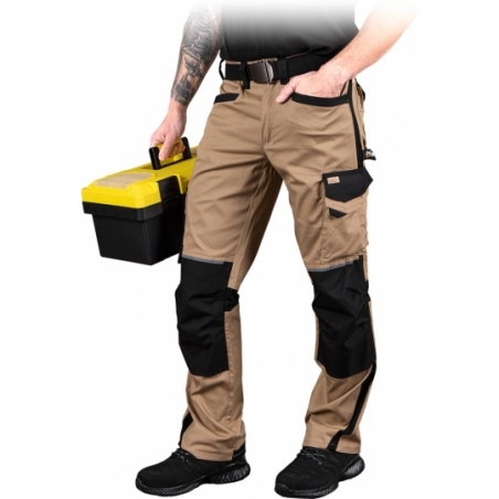 Spodnie ochronne do pasa DESERT. - 97% bawełna, 3% spandex - gramatura 180 g/m2 - siateczkowe wstawki wykonane z 80% nylon i 20% spandexu o gramaturze 170 g/m2 - dwie boczne kieszenie - dwie tylne kieszenie zapinane na rzep - cztery kieszenie na nogawkach, w tym dwie zapinane na rzep - gumka w pasie w tylnej partii zwiększa swobodę ruchów oraz umożliwia lepsze dopasowanie - na kolanach kieszenie na wkładki nakolannikowe - odblaskowe elementy - zastosowanie siateczki wzdłuż nogawek oraz z tyłu na wysokości kolan zapewnia lepszą wentylację - zwiększona wytrzymałość dzięki wstawkom wykonanym z materiału Cordura - uchwyt na młotek na lewej nogawce - idealne na upalne dni