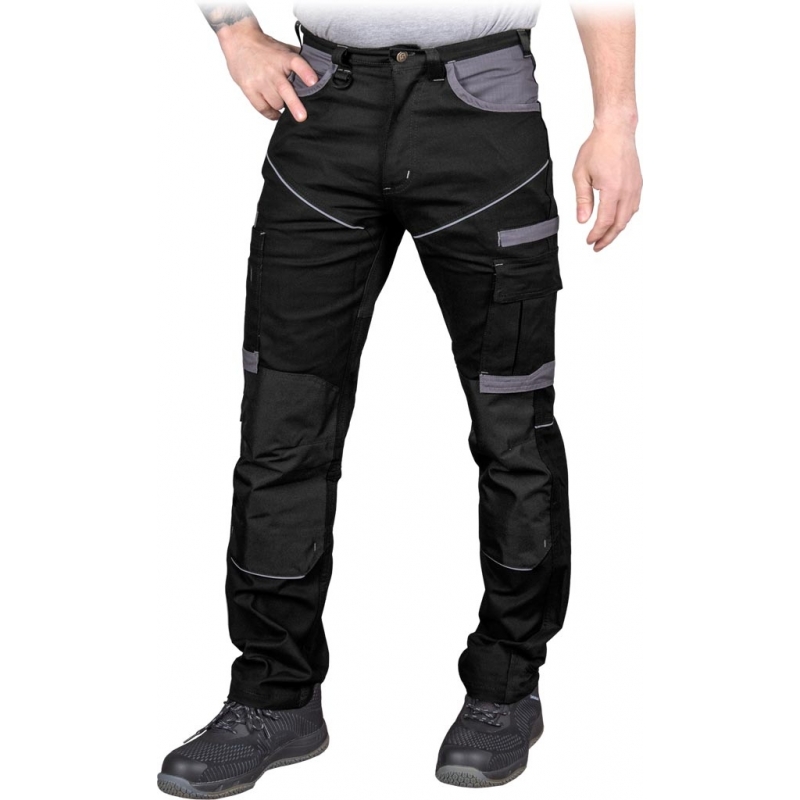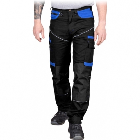 Spodnie ochronne do pasa LEADER. - tkanina: 97% bawełna, 3% spandex o gramaturze 270 g/m2 - wstawki z kontrastowego materiału wykonane z tkaniny typu rip-stop - w tylnej górnej części spodni, kroku oraz w tylnej dolnej części nogawek wstawka z czterokierunkowego streczu - zapinane na guzik i zamek błyskawiczny - trzy kieszenie po bokach, w tym jedna zapinana na suwak - dwie kieszenie z tyłu - kieszenie na nogawkach, w tym na telefon komórkowy - końcówka do przypięcia kluczy - na kolanach kieszenie na wkładki nakolannikowe KING BEE zapinane na rzep wykonane z materiału poliester OXFORD 600D - odblaskowe elementy zapewniają lepszą widoczność - spełniają wymagania normy EN ISO 13688