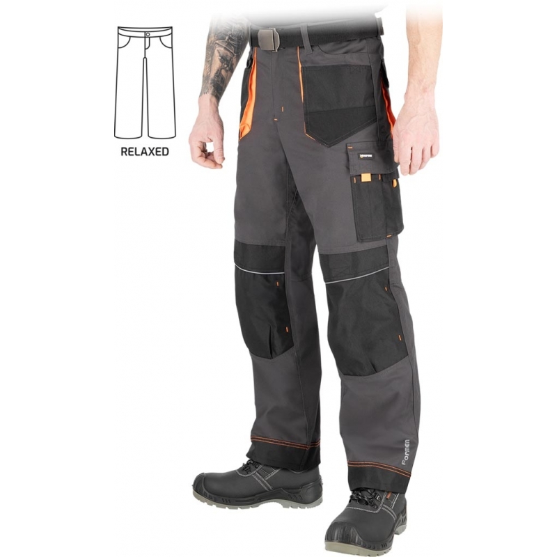 Spodnie ochronne do pasa FORMEN, męskie. - materiał główny: tkanina o splocie canvas 65% poliester, 35% bawełna o gramaturze 270 g/m2 - wstawki: tkanina 100% poliester Oxford 600D o gramaturze 240 g/m2 oraz elementy z tkaniny Cordura - zapinane na guzik oraz zamek błyskawiczny - dwie podwójne kieszenie boczne oraz dwie tylne zapinane na rzep - kieszenie na nogawkach, w tym jedna podwójna zapinana na rzep z przegródkami na akcesoria oraz jedna podłużna z przegródkami - kieszenie na wkładki nakolannikowe wkładane od góry z zapięciem na rzep - gumka w pasie umożliwiająca lepsze dopasowanie - końcówka do przypięcia kluczy - uchwyt na młotek na prawej nogawce - odblaskowe elementy - fason: RELAXED - testowane na zawartość szkodliwych dla zdrowia substancji zgodnie ze standardami OEKO-TEX® Standard 100