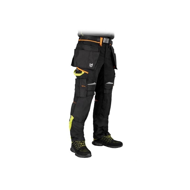 Spodnie ochronne do pasa, męskie. - materiał główny: tkanina 65% poliester, 35% bawełna o gramaturze 290 g/m2 - kontrastowe wstawki: tkanina 80% poliester, 20% bawełna o gramaturze 290 g/m2 - wstawki na kolanach: tkanina 100% poliester Oxford o gramaturze 185 g/m2 - zapinane na guzik oraz zamek błyskawiczny - dwie kieszenie boczne, dwie odsuwane kieszenie monterskie z przegródkami oraz dwie tylne - kieszenie na nogawkach, w tym jedna potrójna z przegródką na telefon komórkowy oraz jedna podwójna podłużna z dodatkową wąską kieszonką na przybory - kieszenie na wkładki nakolannikowe wkładane od góry z zapięciem na rzep - wyprofilowane kolana - dodatkowa szlufka na akcesoria zapinana na rzep - końcówka do przypięcia kluczy - uchwyt na młotek na prawej nogawce - odblaskowe elementy - przeznaczone dla monterów - fason: REGULAR