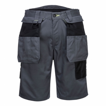- Krótkie spodnie robocze uzupełniające kolekcję PW3 łączą stylowy design z komfortem użytkowania. Posiadają liczne wielofunkcyjne kieszenie w tym kaburowe oraz na linijkę. Dodatkowo wyposażone w kieszeń na identyfikator i zaczep ma młotek. Są bardzo trwałe i wygodne dzięki wzmocnionym panelom oraz specjalnemu wykończeniu okolic krocza. Jest to idealne rozwiązanie do pracy w bardzo gorące dni.