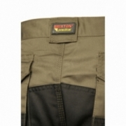 .Budowa/szycie: podwójne i potrójne szwy, szyte mocną nicią, wzmocnienie z tyłu w miejscu narażonym na przetarcie, wstawki kolorystyczne, duża ilość ryglówek w miejscach szczególnie narażonych na rozprucie, spodnie posiadają szlufki na pasek, szlufka na młotek,