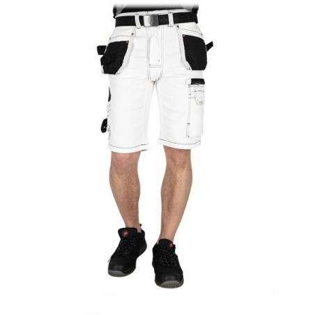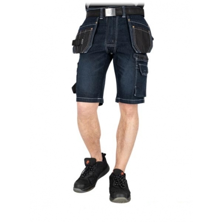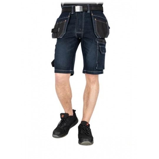 Elastyczne spodnie ochronne do pasa z krótkimi nogawkami, męskie. - materiał główny: tkanina jeansowa o splocie twill 60% bawełna, 24% poliester, 15% wiskoza, 1% elastan o gramaturze 260-300 g/m2 (kolor WB: tkanina o splocie twill 65% bawełna, 33% poliester, 2% elastan) - wstawki: tkanina Cordura 100% poliester powlekana PVC o gramaturze 200 g/m2 - zapinane na guzik oraz zamek błyskawiczny - dwie kieszenie boczne, dwie podwójne kieszenie monterskie oraz dwie tylne, w tym jedna zasłonięta patką - kieszenie na nogawkach, w tym jedna potrójna zapinana na suwak oraz rzep oraz jedna podłużna z przegródkami na akcesoria - pętelki umożliwiające doczepienie dodatkowych akcesoriów - uchwyt na młotek na prawej nogawce