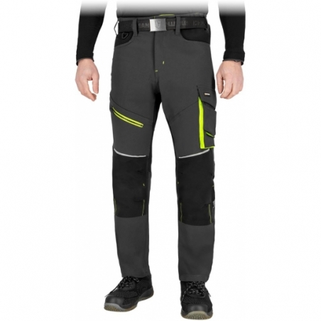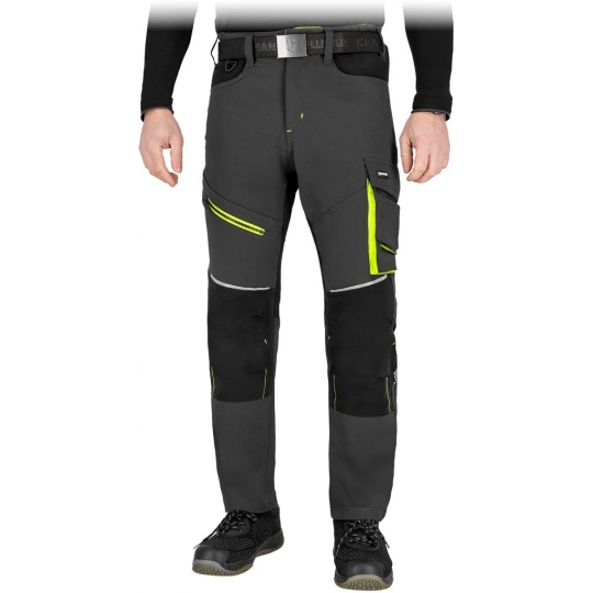 Spodnie ochronne do pasa, męskie. - tkanina: 90% nylon, 10% elastan - gramatura 260 g/m2 - zapinane na guzik oraz zamek błyskawiczny - dwie kieszenie boczne oraz dwie tylne, w tym jedna zapinana na rzep - kieszenie na nogawkach, w tym jedna podwójna zapinana na rzep, jedna zapinana za suwak oraz jedna podłużna - gumka w pasie w bocznych partiach umożliwiająca lepsze dopasowanie - wyprofilowane kolana - końcówka do przypięcia kluczy - odblaskowe elementy - fason: REGULAR