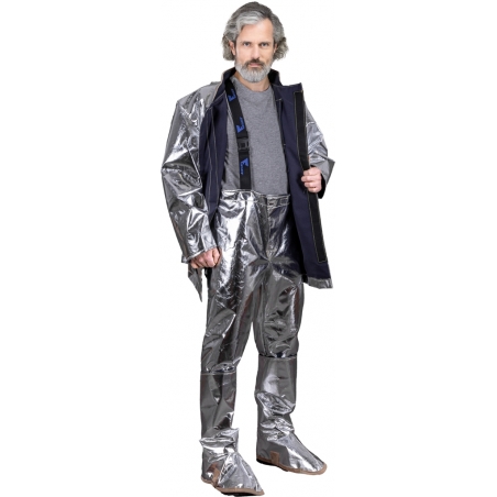 Spodnie ochronne żaroodporne. - wykonana z tkaniny szklanej metalizowanej i tkaniny bawełnianej trudnopalnej stanowiącej podszewkę - spodnie z rozporkiem zakładanym, mocowane są w pasie na zapinki dwudzielne - konstrukcja i wykonanie umożliwiają pracownikowi ich założenie bez konieczności ściągania obuwia - podtrzymywane są na szelkach wykonanych z taśmy niepalnej z możliwością regulacji długości za pomocą klamerek, dzięki takiemu zastosowaniu, użytkowanie jest praktyczne i komfortowe - chronią przed płomieniem, odpryskami płynnego metalu oraz intensywnym promieniowaniem cieplnym - przeznaczone do stosowania łącznie z ubraniem lub inną odzieżą ochronną do pracy przy spuście i rozlewaniu stali oraz metali kolorowych - polecane m.in. dla: odlewnika metali, hartownika, walcownika, wytapiacza - zgodne z normami PN EN ISO 11612 oraz PN EN ISO 13688