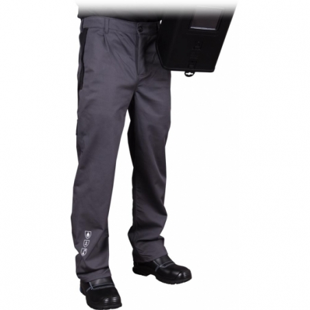Spodnie ochronne UMV-2 antyelektrostatyczne, trudnopalne, chroniące przed ciekłymi chemikaliami. - 87% bawełna, 12% nylon, 1% włókna węglowe - gramatura 270 g/m2 - spodnie do pasa zapinane na guzik - dwie kieszenie boczne oraz dodatkowa kieszeń na prawej nogawce - z tyłu pas z gumą do regulacji obwodu - przeznaczone do prac w środowisku, w którym wymagana jest zdolność do rozpraszania ładunku elektrostatycznego w celu zapobiegania wyładowaniom zapalającym i w którym występuje zagrożenie: zapaleniem w wyniku krótkotrwałego kontaktu z płomieniem, promieniowaniem cieplnym oraz rozpryskiem stopionego żelaza - zgodne z normami EN ISO 13688, EN 1149-5, EN ISO 11612 (A1 A2 B1 C1 E3 F1) oraz EN 13034 (Typ PB [6])