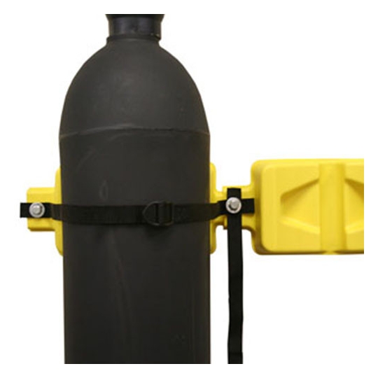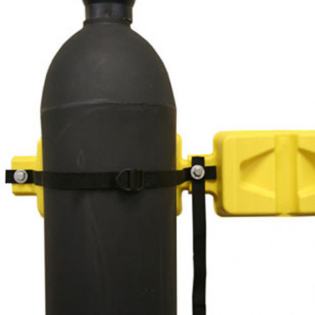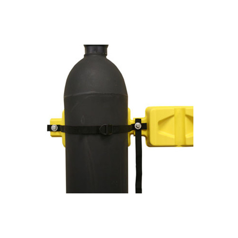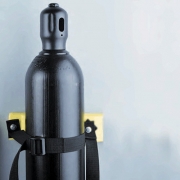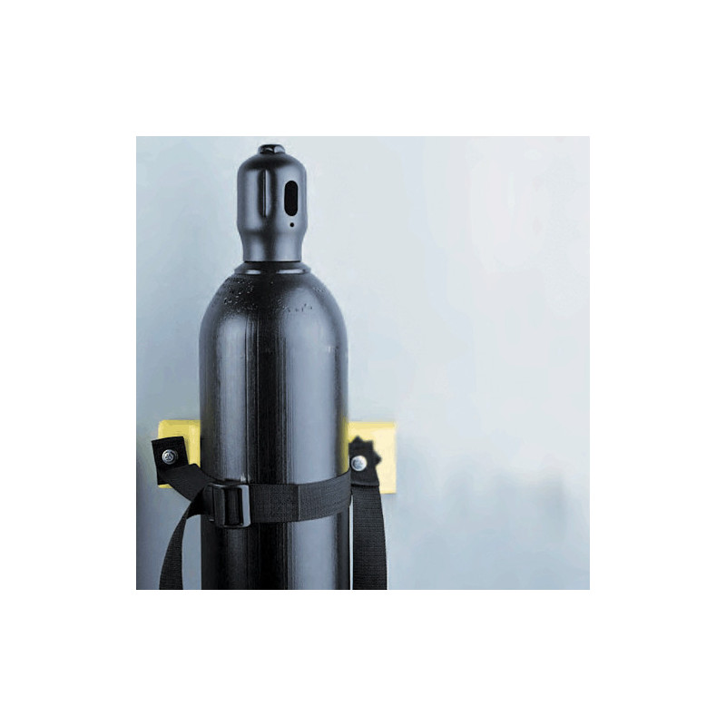 Uchwyt naścienny wykonany w sposób umożliwiający bezpieczne stawianie butli wzdłuż ściany. Dzięki wydrążeniom i nylonowym taśmom butle zabezpieczone są przed przemieszczaniem się.
