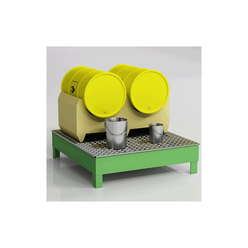 Stojak pod dwie beczki 60 litrowe. Istnieje możliwość łączenia stojaka z wannami wychwytowymi, wózkami do beczek, paletami ekologicznymi, podłogowymi elementami bezpieczeństwa oraz ze stanowiskami z materiałami niebezpiecznymi. W całości zrobiony z polietylenu. Barwa żółta. Z przeznaczeniem na dwie beczki 60 litrowe do przechowywania poziomego.