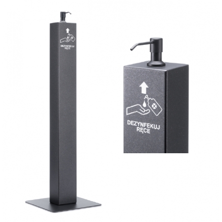 Napis „Dezynfekuj ręce” oraz piktogram naniesione sitodrukiem. Pokryty elegancką farbą proszkową w kolorze szarym.