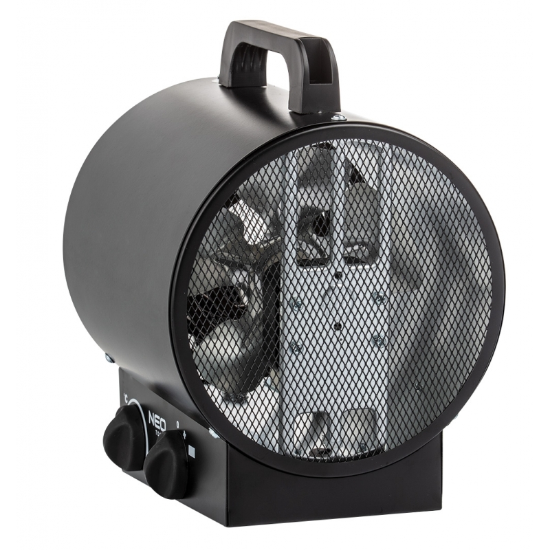 Nagrzewnica elektryczna 2kW przemysłowa, element grzewczy stal nierdzewna, regulowany termostat, ochrona przed przegrzaniem, z wentylatorem, izolowany uchwyt, przepływ powietrza 253 m3/h
