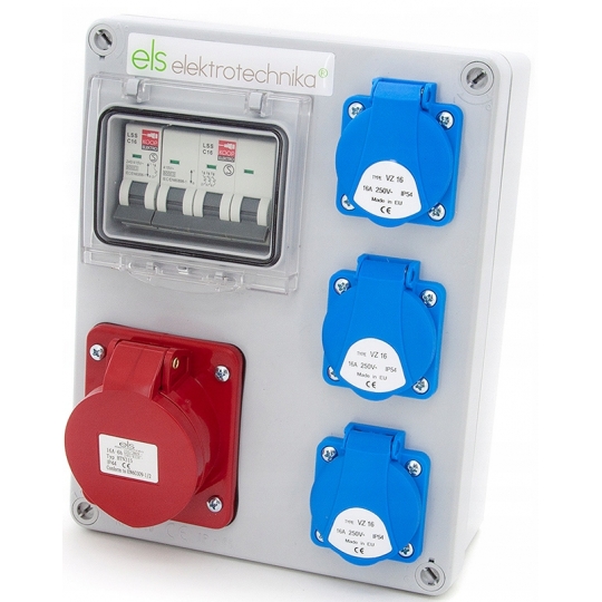 - 1 x gniazdo skośne z niklowanymi stykami 16A 5P 400V IP44 zabezpieczone C16 3P,