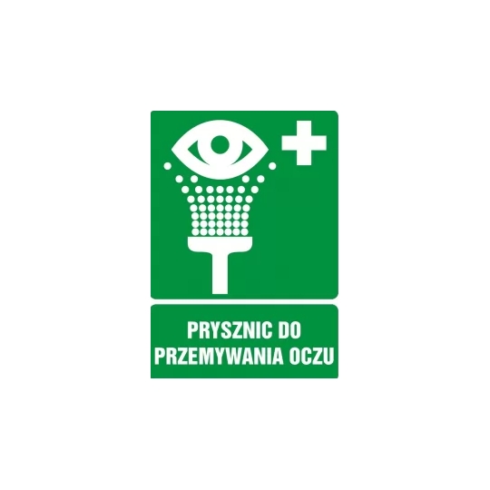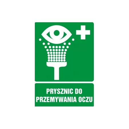 Znak "Prysznic do przemywania oczu". Znak informujący o lokalizacji prysznica, tzw. oczomyjki. Znajduje się w zakładach pracy, gdzie istnieje ryzyko przedostania się do oczu szkodliwych, drażniących substancji.