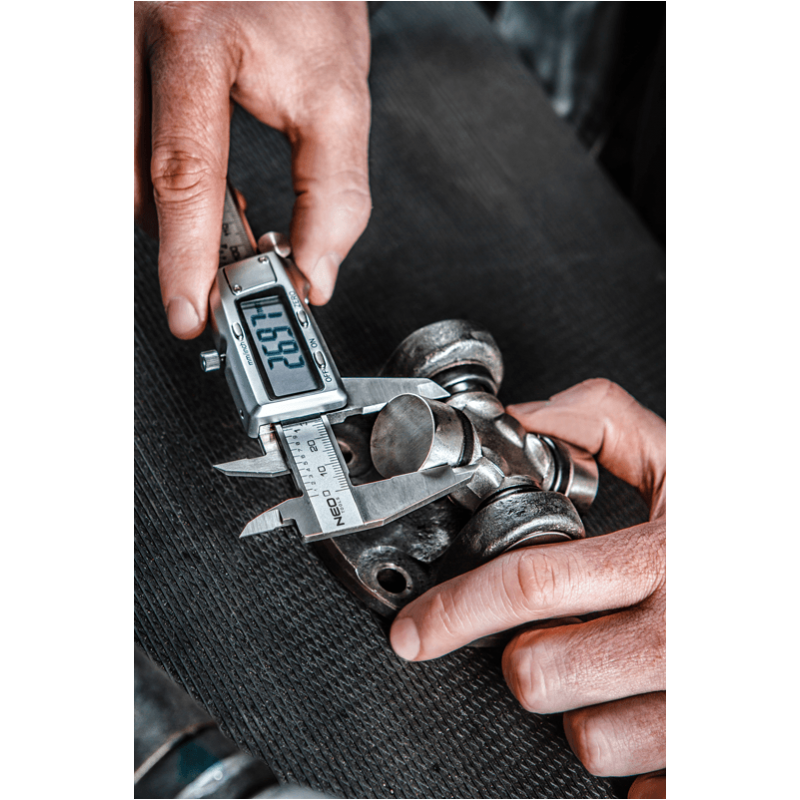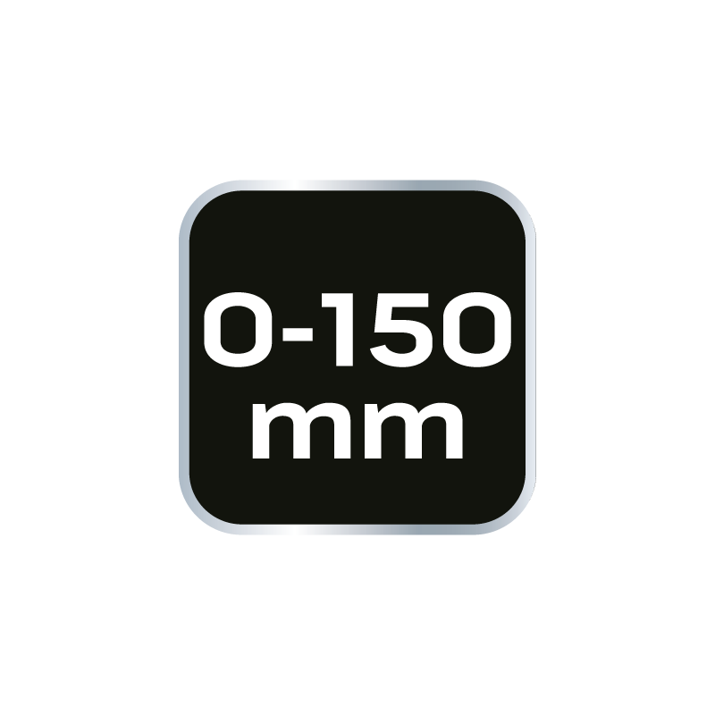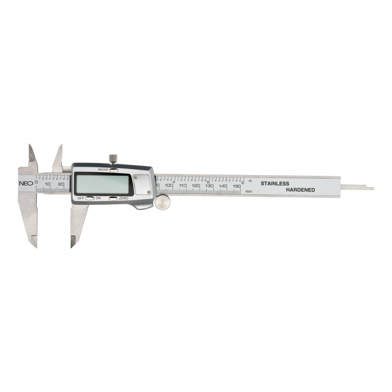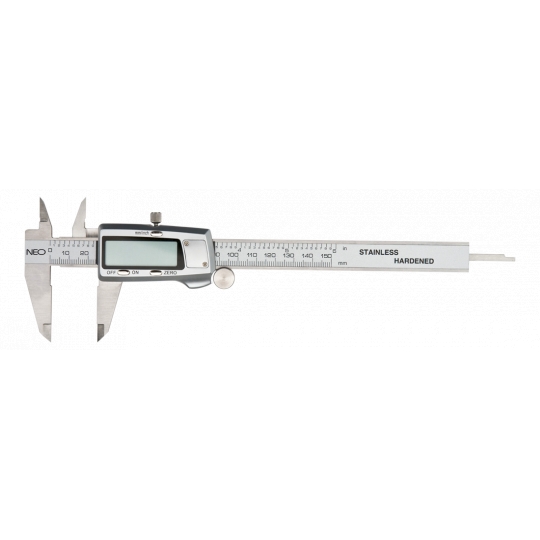 Suwmiarka cyfrowa 150 mm, stal nierdzewna, 5-pozycyjny wyświetlacz, 4-funkcyjna, dokładność pomiaru ±0.02 mm, dowolne ustawienie punktu "0", plastikowe pudełko, CE