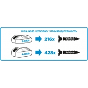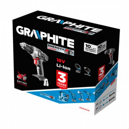 Wiertarko-wkrętarka akumulatorowa 18V, Li-Ion, obroty I: 0-350 min⁻¹ II: 0-1250 min⁻¹, prawo/lewo, uchwyt samozaciskowy 0.8-10 mm, pozycje pierścienia sprzęgła 1-19 (oraz opcja wiercenia), moment obrotowy (miękki/twardy): 28/44 Nm, hamulec wrzeciona, (LxH) 210 x 210 mm, masa 1.1 kg, kompatybilna z akumulatorami Energy+