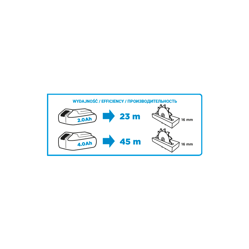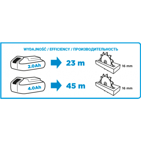 Pilarka tarczowa akumulatorowa 18V, Li-Ion, tarcza 150 x 10 mm, obroty 4200 min⁻¹, cięcie pod kątem 0-45º, gł. cięcia 48/36 mm (90/45º), wskaźnik laserowy, wymiary urządzenia (LxH) 325 x260 mm, masa 2.5 kg, akcesoria: prowadnica równoległa, klucz sześciokątny