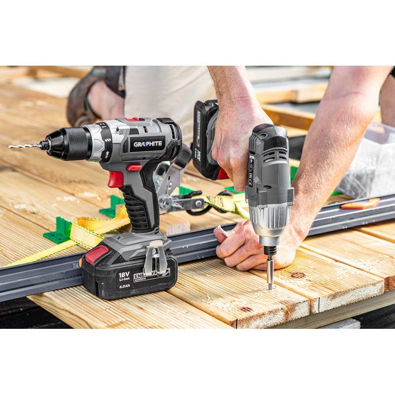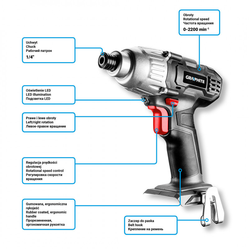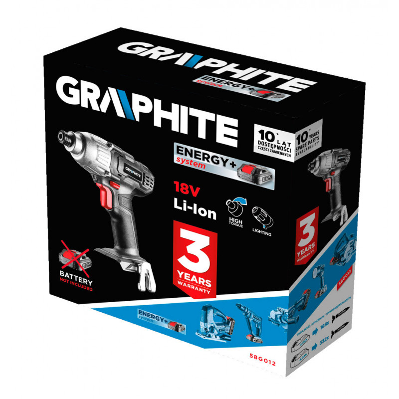 Zakrętarka akumulatorowa 18V, Li-Ion, obroty 0-2200 min⁻¹, prawo/lewo, moment obrotowy 180 Nm, uchwyt narzędziowy 6.35 mm (1/4"), hamulec wrzeciona, (LxH) 185 x 225 mm, masa 1.2 kg, kompatybilna z akumulatorami Energy+