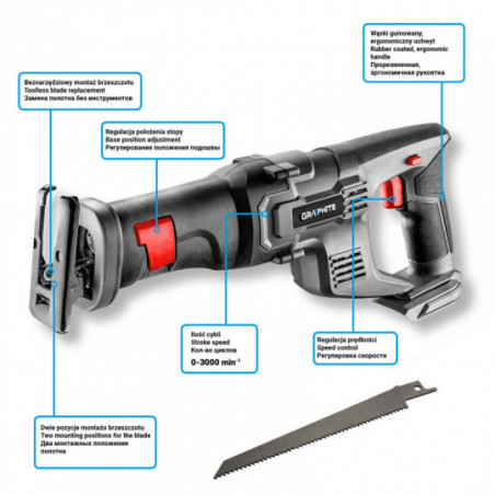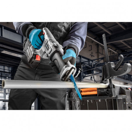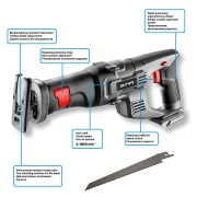 Pilarka szablowa akumulatorowa 18V Li-Ion, skok brzeszczotu 22 mm, ilość cykli brzeszczotu 0-3000 min⁻¹, gł. cięcia w drewnie/stali 60/6 mm, masa 1,85 kg, akcesoria: brzeszczot do drewna - 1 szt, kompatybilna z akumulatorami Energy+