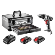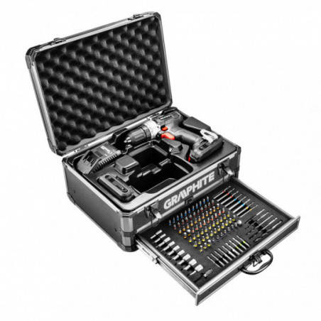 Zestaw Energy+ w walizce aluminiowej: wiertarko wkrętarka, akumulator Energy+ 18V, Li-Ion 2.0Ah - 2 szt, ładowarka. Zawiera 109 akcesoriów: bity 25 mm - 76 szt, bity 50 mm - 9 szt, bity 75 mm - 8 szt, wiertła do drewna - 5 szt, nasadki - 9 szt, fazownik - 1 szt, przedłużka - 1 szt