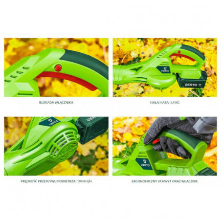 Dmuchawa akumulatorowa 18V, prędkość przepływu powietrza 190 km/h, czas ładowania 3-5 godz., klasa ochronności II, masa 1.4 kg, urządzenie sprzedawane bez akumulatora.