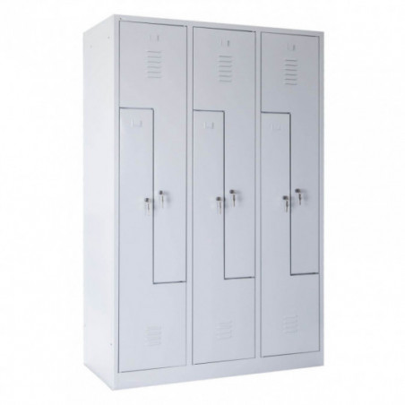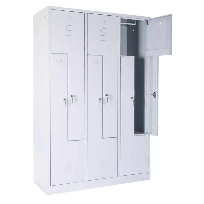 Sześciodrzwiowa szafa ubraniowa SZ-0016-6D typu L o wymiarach 1800x1200x490, w standardzie zamykana zamkiem ryglowym blokującym drzwi w 1 pkt. Grubość blachy wykorzystanej do produkcji wynosi korpus od 0.6 mm do 0.8 mm, drzwi 0.8 mm standardowo wzmocnione profilem metalowym. Szafa wyposażona jest w wizytownik, wentylacje w górnej lub dolnej części drzwi oraz drążek z dwoma haczykami. Standardowo malowana farbą proszkową na kolor RAL 7035 posiadającą atest higieniczny. Możliwość indywidualnej konfiguracji komory, np. dodatkowe półki, metalowy haczyk, zamykanie 3 pkt., stopki poziomujące, daszek, lusterko, nóżki 15 cm lub inne indywidualne rozwiązania. Opcjonalnie szafa może być ustawiona na podstawie z ławką stałą lub wysuwaną.