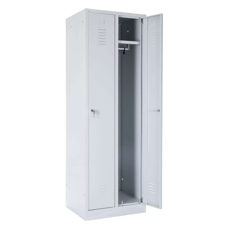 Dwudrzwiowa szafa ubraniowa SZ-0001-2D o wymiarach 1800x600x490, w standardzie zamykana zamkiem ryglowym blokującym drzwi w 1 pkt. Grubość blachy wykorzystanej do produkcji wynosi korpus od 0.6 mm do 0.8 mm, drzwi 0.8 mm standardowo wzmocnione profilem metalowym. Szafa wyposażona jest w wizytownik, wentylacje w górnej i dolnej części drzwi, solidną górną półkę oraz drążek z dwoma haczykami. Standardowo malowana farbą proszkową na kolor RAL 7035 posiadającą atest higieniczny. Możliwość indywidualnej konfiguracji komory, np. dodatkowe półki, metalowy haczyk, zamykanie 3 pkt., stopki poziomujące, daszek, lusterko, nóżki 15 cm lub inne indywidualne rozwiązania. Opcjonalnie szafa może być ustawiona na podstawie z ławką stałą lub wysuwaną.