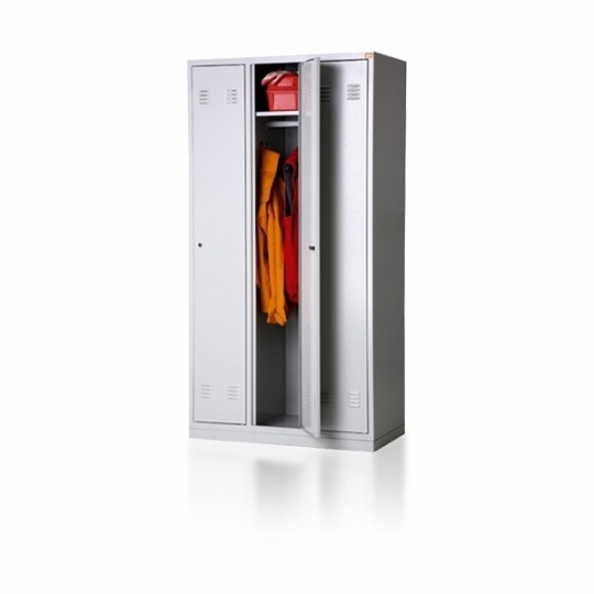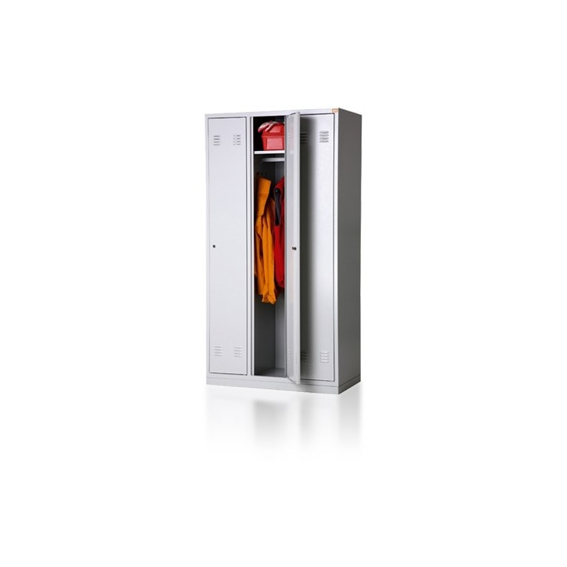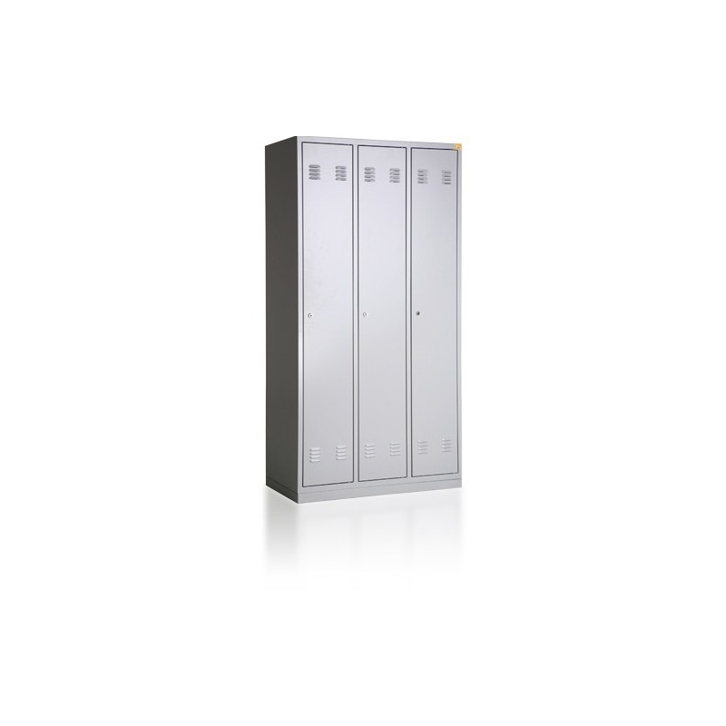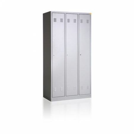 Trzydrzwiowa szafa ubraniowa wyposażona jest w półkę, wieszaki boczne oraz drążek na wieszaki ubraniowe. Wykonana jest z blachy czarnej o grubości 0.6mm-1.0mm, malowana farbami proszkowymi (epoksydowo- poliestrowymi) w kolorze RAL 7035. Zamykana zamkiem krzywkowym w systemie MASTER KEY . Całość osadzona na cokole wykonanym z blachy ocynkowanej (malowanej) o grubości 1.0mm.