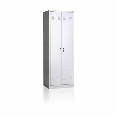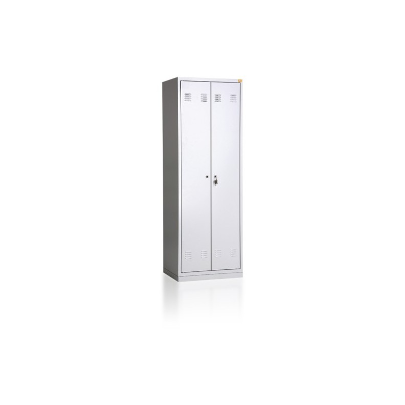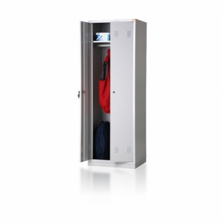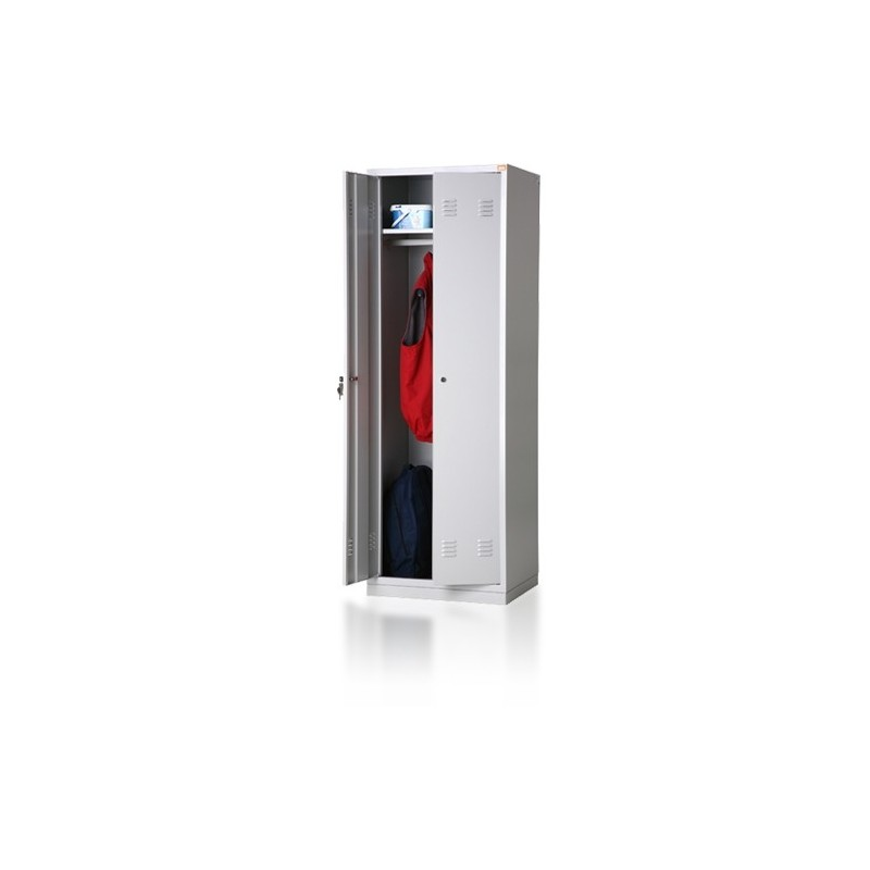 \nDwudrzwiowa szafa ubraniowa wyposażona jest w półkę, wieszaki boczne oraz drążek na wieszaki ubraniowe. Wykonana jest z blachy czarnej o grubości 0.6mm-1.0mm, malowana farbami proszkowymi (epoksydowo- poliestrowymi) w kolorze RAL 7035. Zamykana zamkiem krzywkowym w systemie MASTER KEY . Całość osadzona na cokole wykonanym z blachy ocynkowanej (malowanej) o grubości 1.0mm.