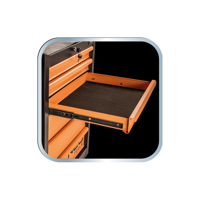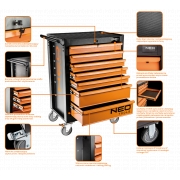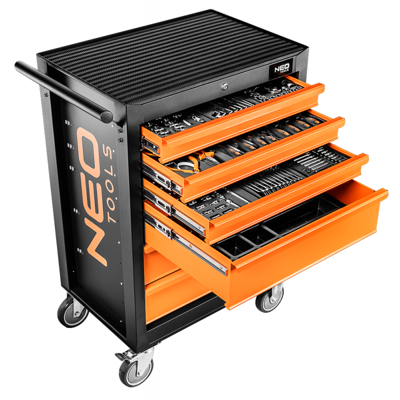 Szafka narzędziowa, 6 szuflad, (LxWxH) 680 x 460 x 1030 mm, nośność 280 kg, stalowy korpus, centralny zamek, gumowa wykładzina na blacie, prowadnice kulkowe, blokada kół, koła 5" z PVC, boczny uchwyt, dwa klucze, dodatkowe wyposażenie w produkty o nr ref. : 84-237, 84-239, 84-238, 84-230, 84-231, 84-232, 84-233, 84-234, 84-236, 84-249