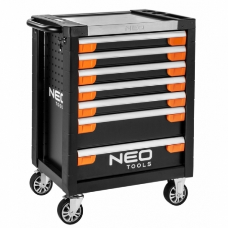 Szafka narzędziowa 7 szuflad, wymiar 775 x 465 x 978 mm, stalowy korpus, udźwig 300kg, aluminiowy blat z miejscami na wkrętaki i akcesoria, perforacja boczna na haki Neo, uchwyt, naklejki na informacje na czoła szuflad, blokada szuflad, szuflady 100% otwierane, kompatybilne z wkładkami narzędziowymi Neo, prowadnice kulkowe, zamek centralny, dwa klucze, blokada kół, w szufladach maty EVA 2mm, koła PU 5 cali., dodatkowe wyposażenie w produkty o nr ref. : 84-249; 84-247; 84-242; 84-239; 84-238; 84-237; 84-236; 84-235; 84-234; 84-233; 84-232; 84-231; 84-230