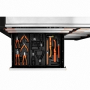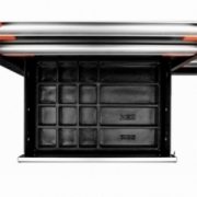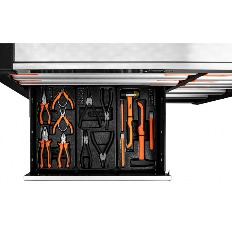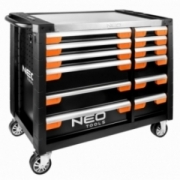 Szafka narzędziowa 12 szuflad 1105x465x825 mm (z kołami 978mm), 6 dużych w tym 3 niskie, wymiar 560 x 400 x 60 mm i 3 wysokie wymiar 560 x 400 x 139 mm, 6 małych w tym 3 niskie wymiar 252.5 x 400 x 60 mm i 3 wysokie wymiar 252.5 x 400 x 139mm, stalowy korpus, udźwig 600kg, aluminiowy blat z miejscami na wkrętaki i akcesoria, perforacja boczna na haki oraz akcesoria NEO, odbojniki narożne, uchwyt boczny, blokada szuflad, szuflady 100% otwierane, kompatybilne z wkładkami narzędziowymi Neo, prowadnice kulkowe, zamek centralny, dwa klucze, blokada kół, szuflady wyposażone w maty EVA wysokość 2mm, koła PU 5 cali. Dodatkowe wyposażenie szafki nr. ref.: 84-249, 84-247, 84-246, 84-242, 84-241, 84-240, 84-239, 84-238, 84-237, 84-236, 84-235, 84-234, 84-233, 84-232, 84-231, 84-230