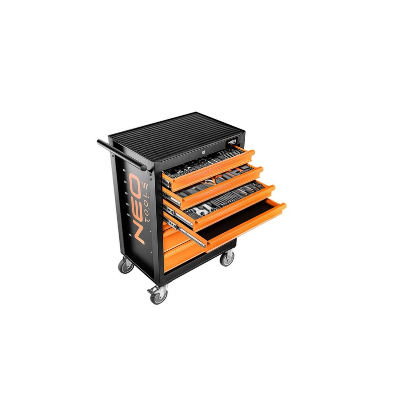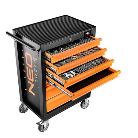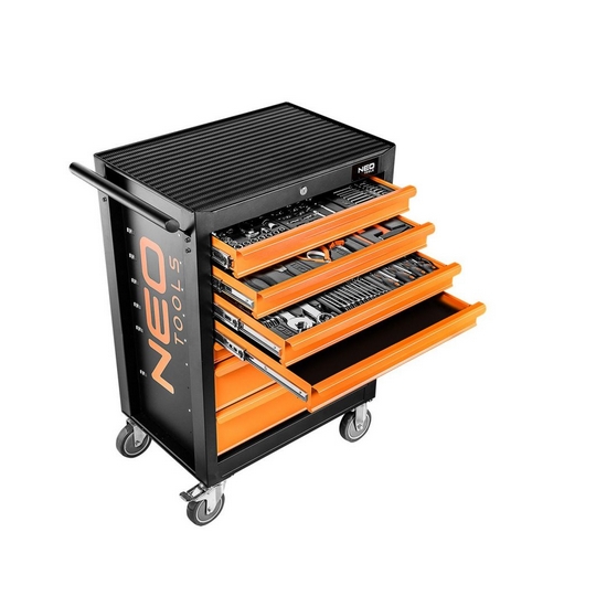 Szafka narzędziowa, 7 szuflad, (LxWxH) 680 x 460 x 1030 mm, nośność 280 kg, stalowy korpus, centralny zamek, gumowa wykładzina na blacie, prowadnice kulkowe, blokada kół, koła 5" z PVC, boczny uchwyt, dwa klucze,dodatkowe wyposażenie w produkty o nr ref.: 84-230, 84-232, 84-234, 84-235, 84-236, 84-237, 84-238, 84-240, 84-242.