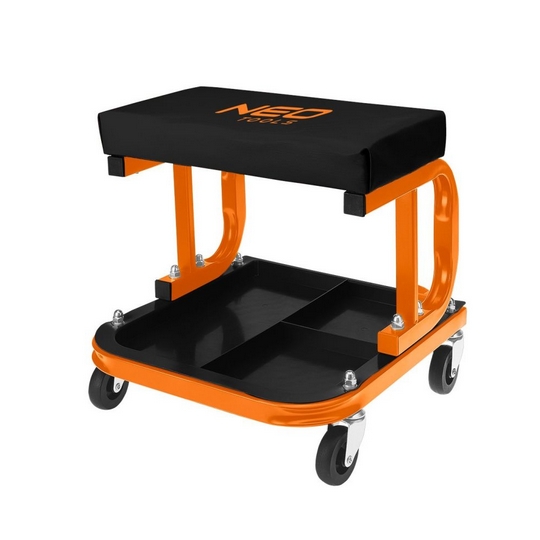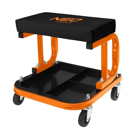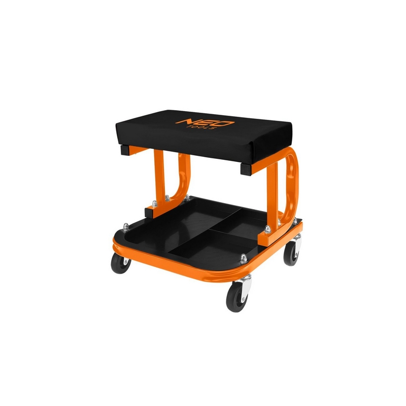 Stołek warsztatowy, 4 kółka obrotowe - 360 stopni, średnica kółka: 2,5", maksymalny udźwig: 136 kg, waga: 4,5 kg, wymiary: dł. 36,5 cm, szer. 35,5 cm, wys. 37, wys. bez kół 30 cm, wymiary siedziska 37 cm x 20,5 cm