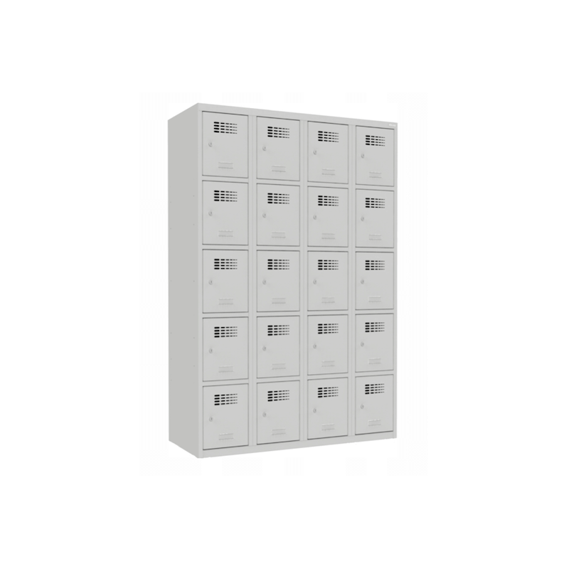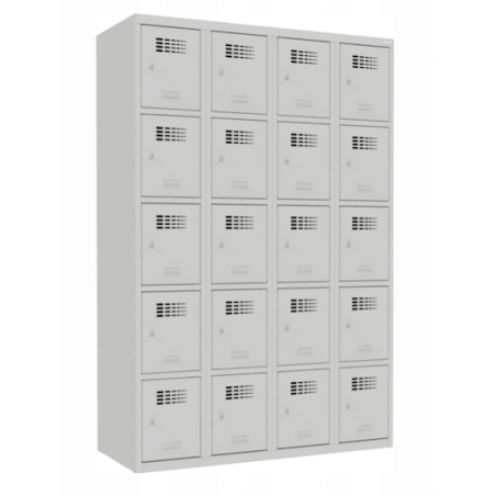 \n \n \nSzafę ze schowkami SUS 345 W wyposażono w dwadzieścia oddzielnie zamykanych schowków, rozmieszczonych po pięć schowków w czterech kolumnach. Każdy ze schowków zamykany jest za pomocą zamka cylindrycznego z ryglowaniem w jednym punkcie. Na drzwiach wykonana została nowoczesna perforacja umożliwiająca cyrkulację powietrza, a także umieszczone zostały plastikowe samoprzylepne wizytowniki do opisania przedziałów. Konstrukcję szafy stanowią zgrzewane profile zamknięte, które wraz z pozostałymi elemntami szafy, wykonane zostały z blachy o grubości 0,5 mm. Model SUS 345 W malowany jest przy użyciu farby proszkowej, zapewniającej podwyższone własności antykorozyjne oraz wysoką przyczepność powłoki. \n \n