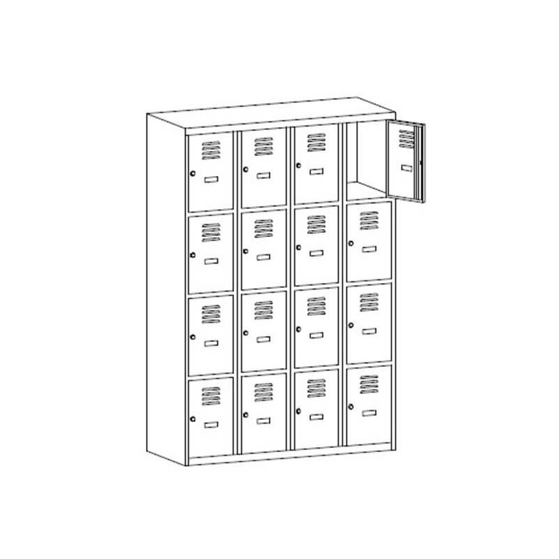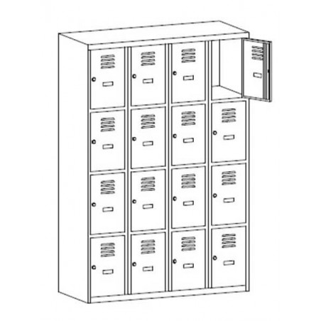 Szafa ze schowkami SUS 344 W to rozbudowany model z serii mebli socjalnych, który oferuje aż szesnaście przedziałów. Szafa doskonale sprawdza się w pomieszczeniach socjalnych biur oraz zakładów pracy, a także w szatniach szkolnych, przedszkolnych czy sportowych. Dzięki niej możliwe jest bezpieczne i funkcjonalne przechowywanie przedmiotów osobistych oraz odzieży, zabezpieczając je tym samym przed dostępem osób trzecich. Szafa ze schowkami SUS 344 W wyróżnia się przede wszystkim stabilną i sztywną konstrukcją, dzięki której szafa będzie służyć Państwu przez długie lata. Dużym atutem jest także różnorodność wersji szafy, która może występować także na nóżkach, cokole lub podstawie w jednym z 16 kolorów palety Ral.
