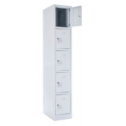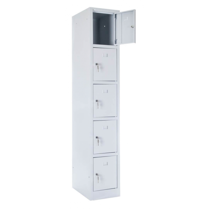 Pięciodrzwiowa szafa ubraniowa SZ-0015/4-5D typu L o wymiarach 1800x400x490, w standardzie zamykana zamkiem ryglowym blokującym drzwi w 1 pkt. Grubość blachy wykorzystanej do produkcji wynosi korpus od 0.6 mm do 0.8 mm, drzwi 0.8 mm standardowo wzmocnione profilem metalowym. Szafa wyposażona jest w wizytownik, wentylacje w górnej i dolnej części drzwi oraz drążek z dwoma haczykami. Standardowo malowana farbą proszkową na kolor RAL 7035 posiadającą atest higieniczny. Możliwość indywidualnej konfiguracji komory, np. dodatkowe półki, metalowy haczyk, zamykanie 3 pkt., stopki poziomujące, daszek, lusterko, nóżki 15 cm lub inne indywidualne rozwiązania. Opcjonalnie szafa może być ustawiona na podstawie z ławką stałą lub wysuwaną.