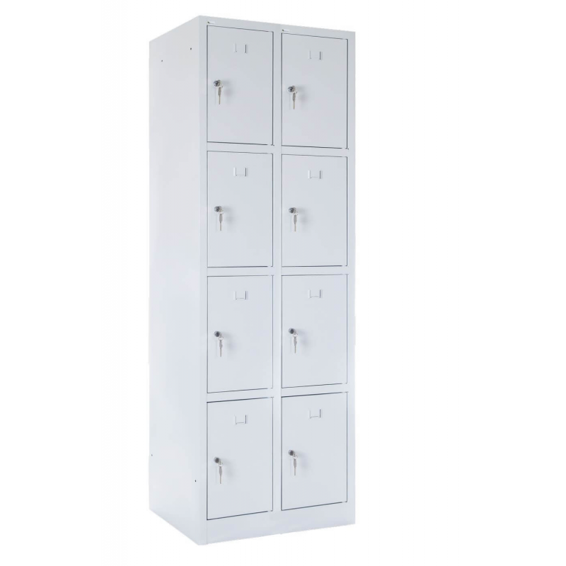 Ośmiodrzwiowa szafa ubraniowa SZ-0019-8D typu L o wymiarach 1800x800x490, w standardzie zamykana zamkiem ryglowym blokującym drzwi w 1 pkt. Grubość blachy wykorzystanej do produkcji wynosi korpus od 0.6 mm do 0.8 mm, drzwi 0.8 mm standardowo wzmocnione profilem metalowym. Szafa wyposażona jest w wizytownik, wentylacje w górnej i dolnej części drzwi oraz drążek z dwoma haczykami. Standardowo malowana farbą proszkową na kolor RAL 7035 posiadającą atest higieniczny. Możliwość indywidualnej konfiguracji komory, np. dodatkowe półki, metalowy haczyk, zamykanie 3 pkt., stopki poziomujące, daszek, lusterko, nóżki 15 cm lub inne indywidualne rozwiązania. Opcjonalnie szafa może być ustawiona na podstawie z ławką stałą lub wysuwaną.