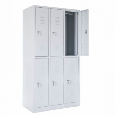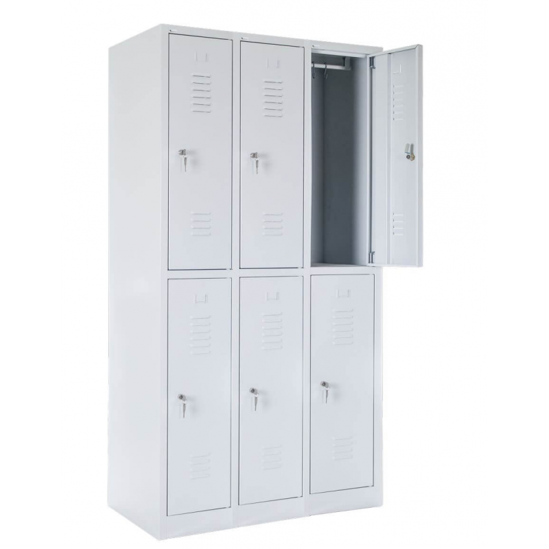 Sześciodrzwiowa szafa ubraniowa SZ-0014-6D typu L o wymiarach 1800x1200x490, w standardzie zamykana zamkiem ryglowym blokującym drzwi w 1 pkt. Grubość blachy wykorzystanej do produkcji wynosi korpus od 0.6 mm do 0.8 mm, drzwi 0.8 mm standardowo wzmocnione profilem metalowym. Szafa wyposażona jest w wizytownik, wentylacje w górnej i dolnej części drzwi oraz drążek z dwoma haczykami. Standardowo malowana farbą proszkową na kolor RAL 7035 posiadającą atest higieniczny. Możliwość indywidualnej konfiguracji komory, np. dodatkowe półki, metalowy haczyk, zamykanie 3 pkt., stopki poziomujące, daszek, lusterko, nóżki 15 cm lub inne indywidualne rozwiązania. Opcjonalnie szafa może być ustawiona na podstawie z ławką stałą lub wysuwaną.