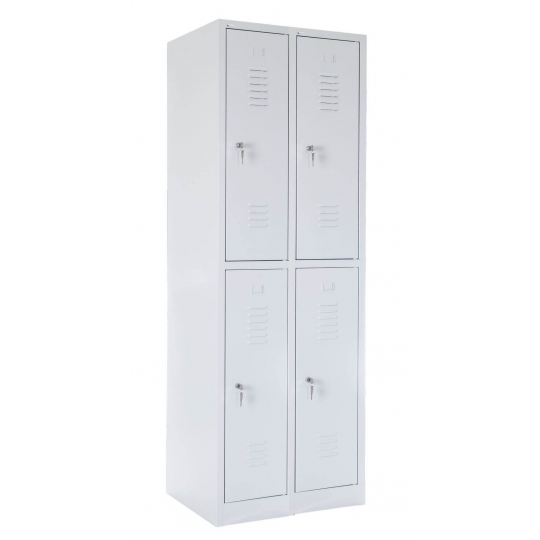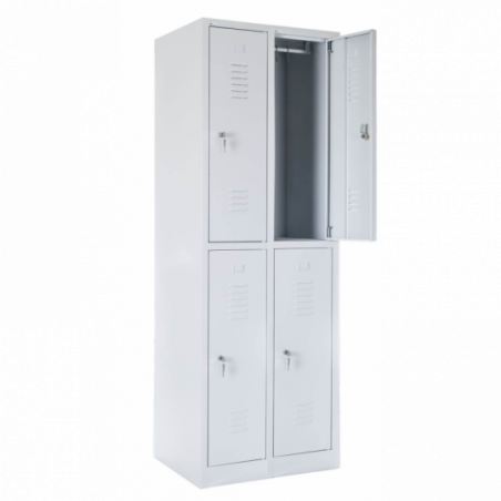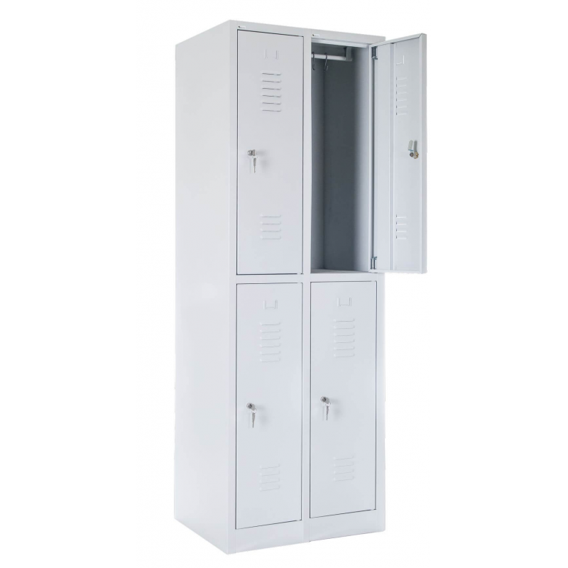 Czterodrzwiowa szafa ubraniowa SZ-0013-4D typu L o wymiarach 1800x600x490, w standardzie zamykana zamkiem ryglowym blokującym drzwi w 1 pkt. Grubość blachy wykorzystanej do produkcji wynosi korpus od 0.6 mm do 0.8 mm, drzwi 0.8 mm standardowo wzmocnione profilem metalowym. Szafa wyposażona jest w wizytownik, wentylacje w górnej i dolnej części drzwi oraz drążek z dwoma haczykami. Standardowo malowana farbą proszkową na kolor RAL 7035 posiadającą atest higieniczny. Możliwość indywidualnej konfiguracji komory, np. dodatkowe półki, metalowy haczyk, zamykanie 3 pkt., stopki poziomujące, daszek, lusterko, nóżki 15 cm lub inne indywidualne rozwiązania. Opcjonalnie szafa może być ustawiona na podstawie z ławką stałą lub wysuwaną.