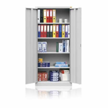 \nSzafa biurowa posiada dwa skrzydła drzwi uchylnych zawieszone na zawiasach kołkowych. Wyposażona jest w cztery półki przestawne co 90mm. Wykonana z blachy czarnej o grubości 0.8mm- 1mm, malowana farbami proszkowymi (epoksydowo-poliestrowymi) w kolorze RAL 7035. Zamykana zamkiem baskwilowym, ryglującym w trzech punktach i wykończonym uchwytem klamkowym. Udźwig półki: 50kg