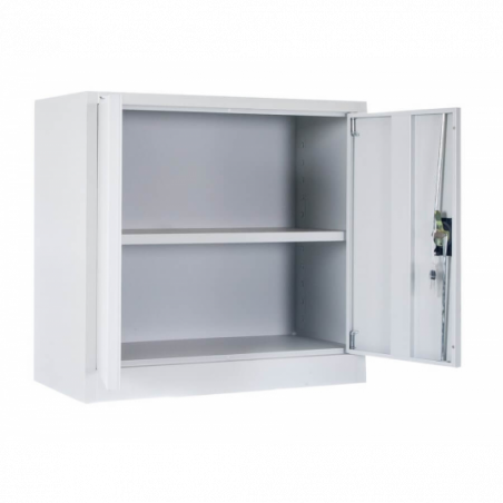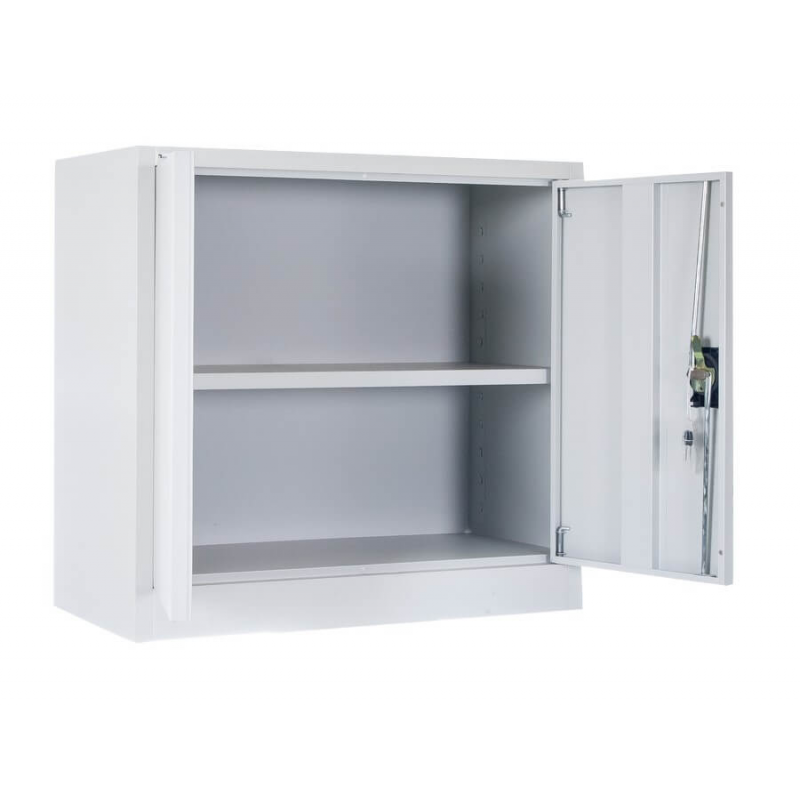 Szafa biurowa SZ-0003 o wymiarach 1000x800x420 posiada dwa skrzydła drzwi uchylnych zawieszone na zawiasach kołkowych. Wyposażona jest w jedną półkę przestawną co 50mm. Wykonana z blachy czarnej o grubości 0.6mm- 0.8mm, standardowo malowana farbami proszkowymi (epoksydowo-poliestrowymi) w kolorze RAL 7035. Zamykana zamkiem baskwilowym, ryglującym w dwóch punktach i wykończonym uchwytem klamkowym. Udźwig półki: 60kg