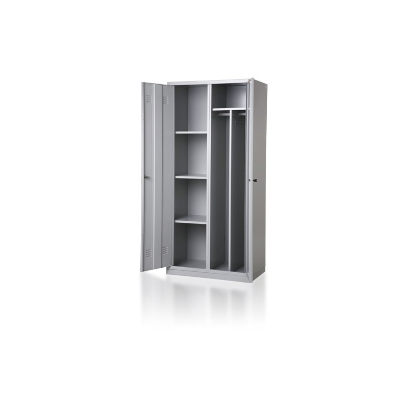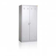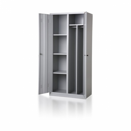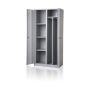 \nDwudrzwiowa szafa ubraniowa wyposażona jest w trzy półki z lewej strony, natomiast z prawej, w półkę, wieszaki boczne oraz drążek na wieszaki ubraniowe. Prawa komora posiada również podział wewnętrzny (czyste/ brudne). Szafa wykonana jest z blachy czarnej o grubości 0.6mm-1.0mm, malowana farbami proszkowymi (epoksydowo- poliestrowymi) w kolorze RAL 7035. Zamykana zamkiem krzywkowym w systemie MASTER KEY. Całość osadzona na cokole wykonanym z blachy ocynkowanej (malowanej) o grubości 1.0mm.