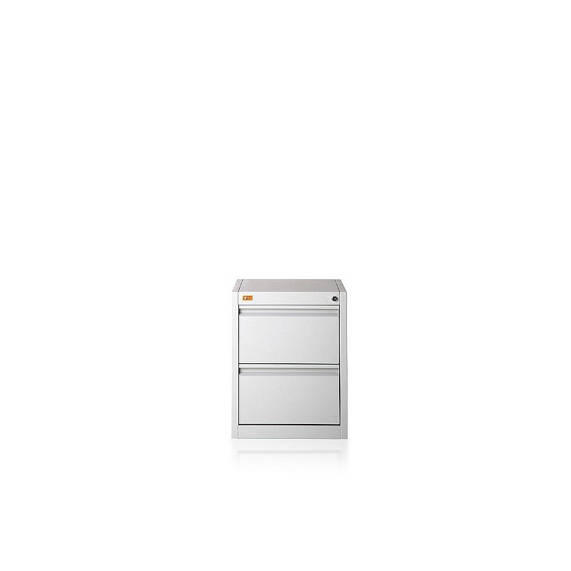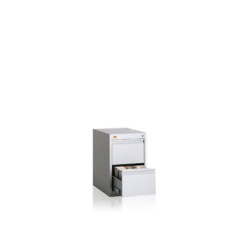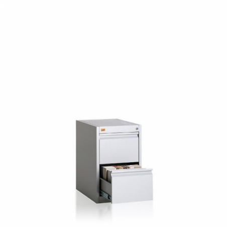 Dwuszufladowa szafa przystosowana do przechowywania segregatorów oraz teczek zawieszkowych formatu A-4 w poziomie. Wykonana jest z blachy czarnej o grubości od 0,6mm- 2 mm, malowana farbami proszkowymi (epoksydowo-poliestrowymi) w kolorze RAL 7035. Szuflady przesuwają się po prowadnicach teleskopowych z blokadą zabezpieczającą przed wypadnięciem. Całość zamykana jednym centralnym zamkiem. Maksymalne obciążenie prowadnic szuflady: 45kg. Szafa posiada blokadę pozwalająca na wysunięcie tylko jednej szuflady, co zachowuje jej stabilność.