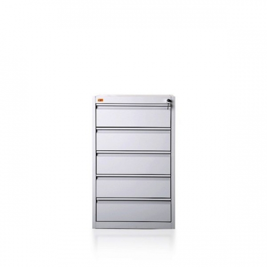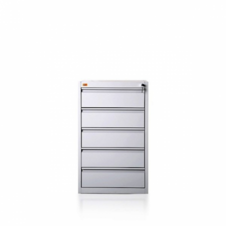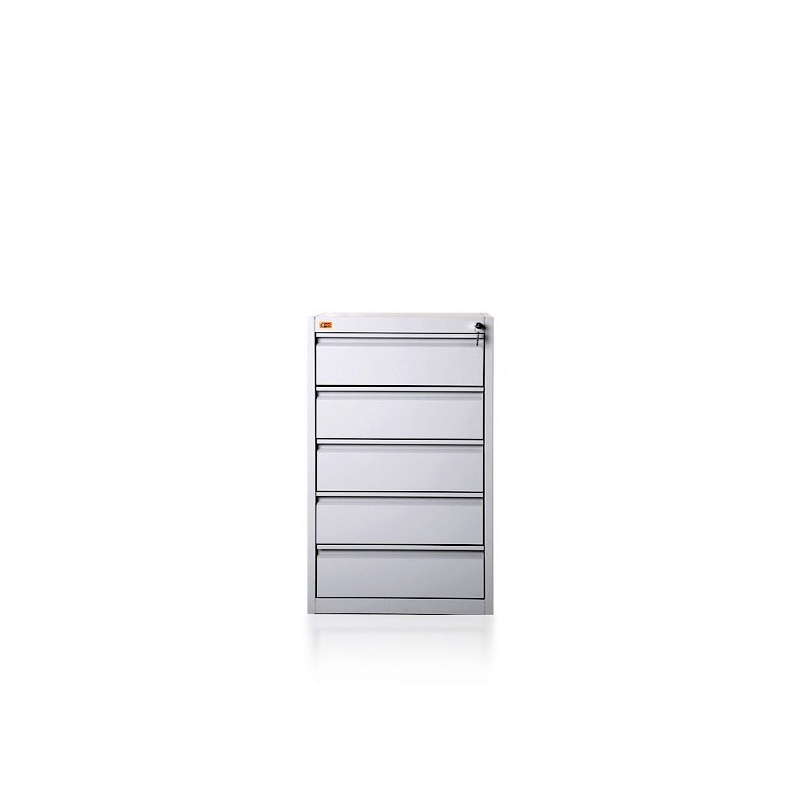 \nPięcioszufladowa szafa przystosowana do przechowywania kartotek formatu A-5. Szuflada posiada przegrodę umożliwiającą ułożenie dwóch rzędów kartotek w poziomie. Wykonana jest z blachy czarnej o grubości od 0,6mm- 2,0 mm, malowana farbami proszkowymi (epoksydowo-poliestrowymi) w kolorze RAL 7035. Szuflady przesuwają się po prowadnicach teleskopowych z blokadą zabezpieczającą przed wypadnięciem. Całość zamykana jednym centralnym zamkiem. Maksymalne obciążenie prowadnic szuflady: 80kg. Szafa posiada blokadę pozwalająca na wysunięcie tylko jednej szuflady, co zachowuje jej stabilność.