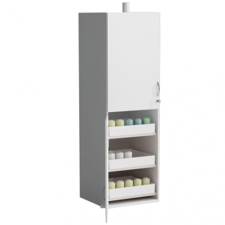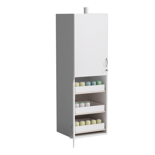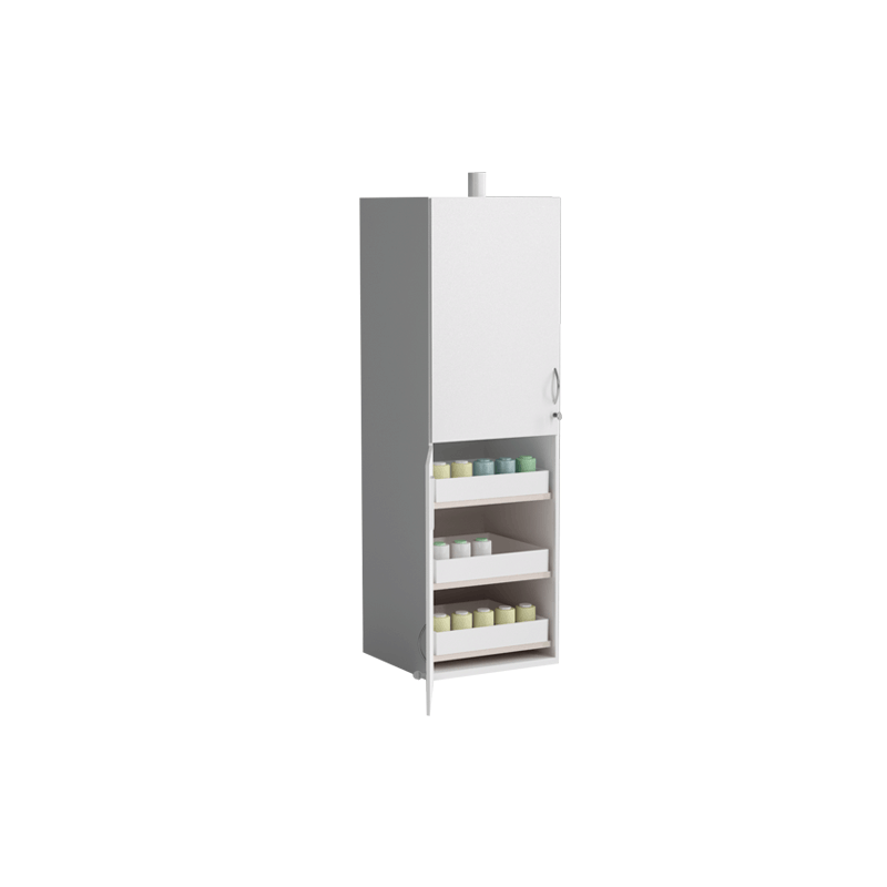 Szafa ekologiczna wyprodukowana z płyt HPL. Niezwykle odporna na wszelkie uszkodzenia mechaniczne, takie jak; tarcie, zadrapania i uderzenia. Lakierowana RAL 7035. Barwa jasnoszara. Wnętrze zrobione z komponentów niepodatnych na korozję. Drzwi z oddzielnym zamkiem cylindrycznym. Zatwierdzone przechowywanie zgodnie z TRGS 526 / BGR120. Odpowiedni podział na osobne przechowywanie kwasów i ługu w osobnych sekcjach. Naturalna wentylacja odbywa się za pomocą kratki w tylnej ścianie. DN 75 podłączenie wentylacji do wentylatora w górnej części szafy. Szafa posiada wyciągane półki, których maksymalne obciążenie wynosi 20 kg.