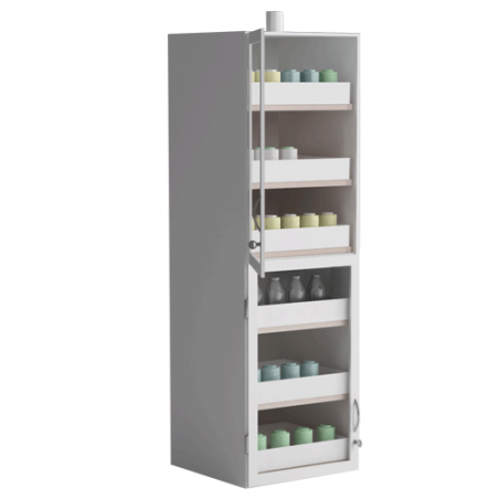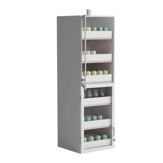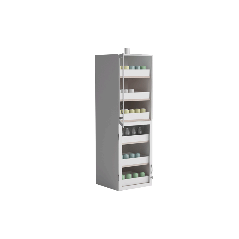 Szafa ekologiczna z płyt HPL. Niezwykle odporna na uszkodzenia mechaniczne, takie jak; uderzenia, zadrapania oraz otarcia. Lakierowana RAL 7035. Barwa jasnoszara. Wnętrze szafy zrobione z komponentów niepodatnych na korozję. Drzwi z oddzielnym zamkiem cylindrycznym. Zatwierdzone przechowywanie zgodnie z TRGS 526 / BGR120. Odpowiedni podział na osobne miejsca do przechowywania kwasów i ługu w oddzielnych sekcjach. Naturalna wentylacja za pomocą kratki w tylnej ścianie. DN 75 podłączenie wentylacji do wentylatora w górnej części szafy. Półki wyciągane, których maksymalne obciążenie może wynieść 20 kg.