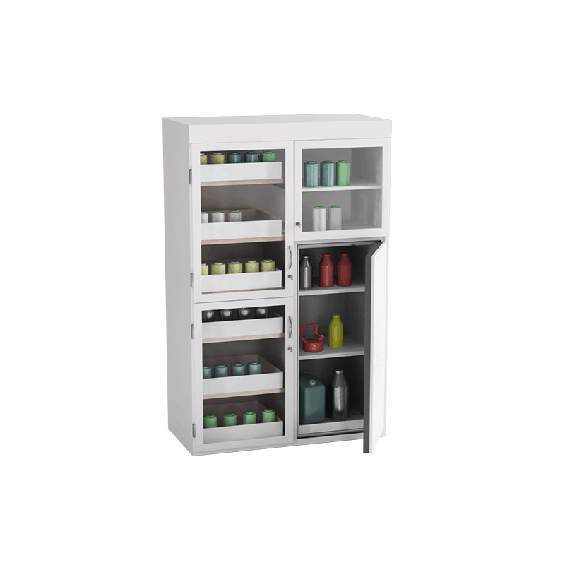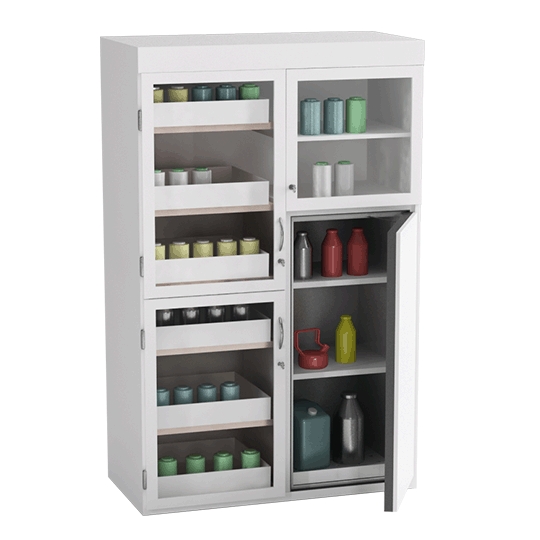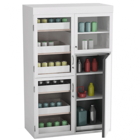 Do bezpiecznego przechowywania cieczy palnych w miejscu pracy zgodnie z EN 14470-1 (typ 60). Zewnętrzna powierzchnia z lakierowanej proszkowo blachy stalowej albo RAL 7035 jasno szary kolor lub RAL 1007 jaskrawo żółty kolor. Wewnątrz płyty HPL, RAL 7035. Podstawowa płyta z nierdzewnej stali. Wysokość półek regulowana, z odstępem około 60 mm. Automatyczny samozamykający mechanizm na wypadek pożaru, drzwi zamykają się powyżej temperatury 50˚C. Otwory wentylacyjne zamykają się przy temperaturze powyżej 70˚C (±10˚C). DN 75 podłączenie wentylacji do wentylatora. Zgodna z TRbF 20-L, zatwierdzona z i bez systemu wentylacyjnego. Drzwi z zamkiem cylindrycznym z 4, 5 lub 6 półkami wannowymi.