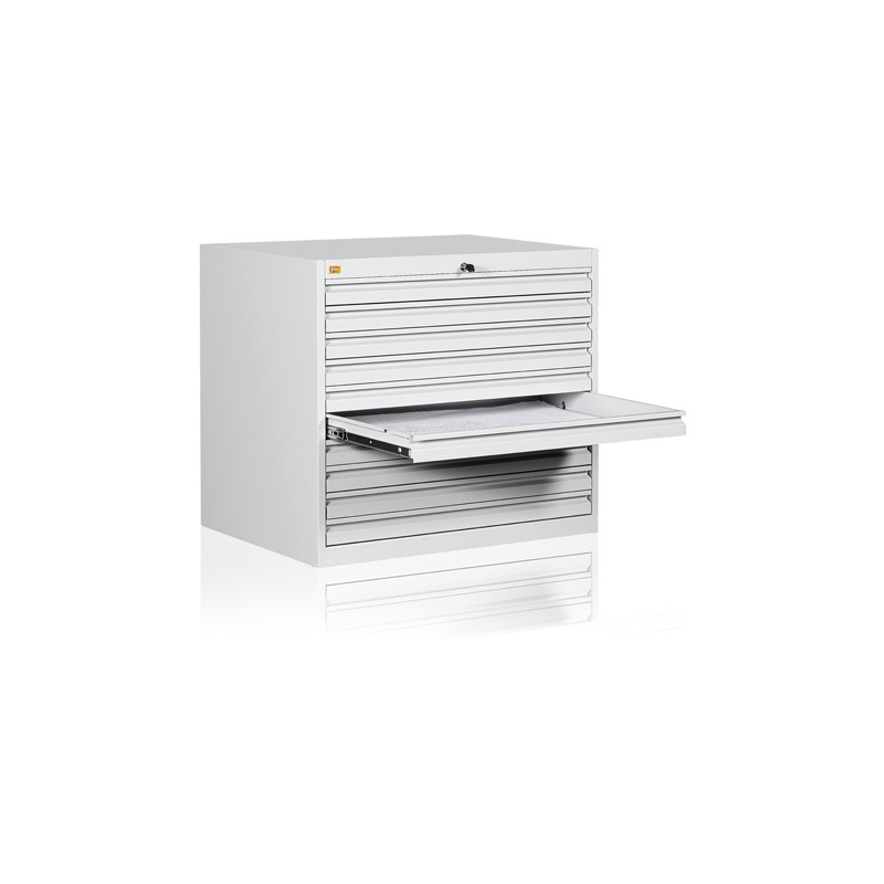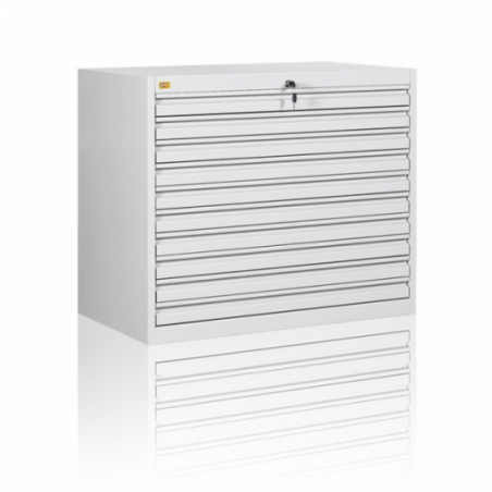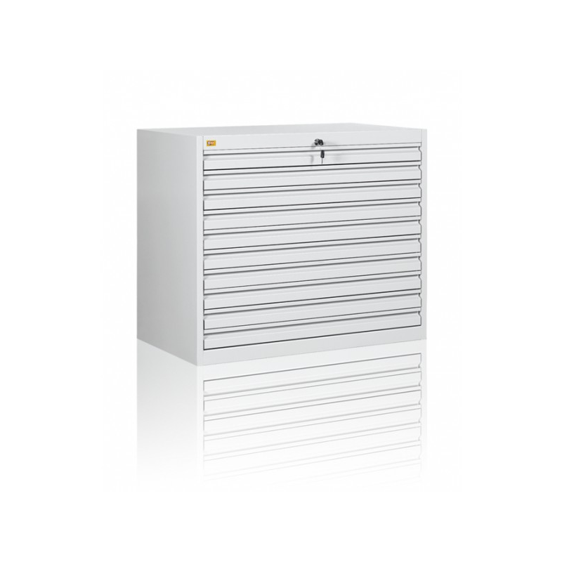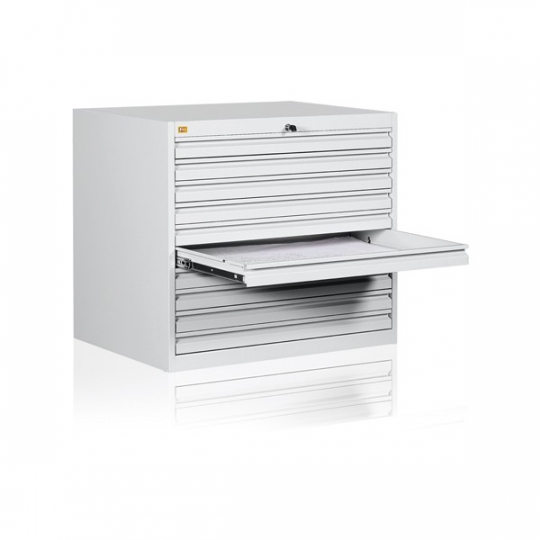 Dziesięcioszufladowa szafa przystosowana do przechowywania map, planów, dokumentacji technicznych oraz montaży poligraficznych o maksymalnym formacie A-1. Wykonana jest z blachy czarnej o grubości 0,6mm – 2,0mm, malowana farbami proszkowymi (epoksydowo-poliestrowymi) w kolorze RAL 7035. Szuflady przesuwają się po prowadnicach teleskopowych z blokadą zabezpieczającą przed wypadnięciem. Całość zamykana jednym centralnym zamkiem. Waga szafy 135kg.