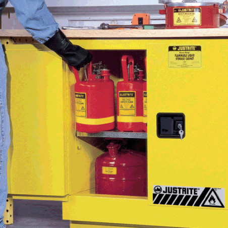 Szafa stojąca do bezpiecznego przechowywania palnych materiałów. Ułatwia dostęp do cieczy w miejscu pracy. Łatwo dostępne podwójne wentyle z wbudowaną ochroną przed płomieniami na tylnej ścianie szafy. Regulowane nóżki do regulacji na nierównych powierzchniach - do 29 mm.